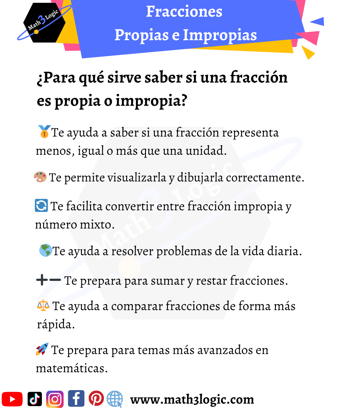 Saber diferenciar entre fracciones propias (menores a la unidad) y fracciones impropias (mayores a la unidad) es crucial para lograr una comprensión más profunda en ciertos temas, tales como