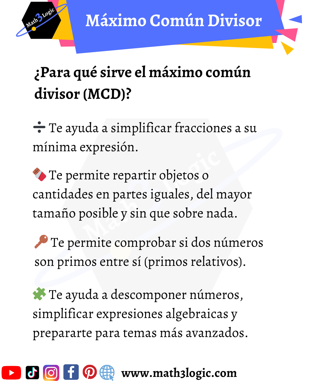El Máximo Común Divisor de dos o más números es el número más grande de todos los divisores que tienen en común.